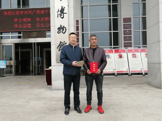 4月25日,周口市博物館收到周口市文昌辦事處李莊社區(qū)村委委員趙團結(jié)向捐贈的兩件唐代黃釉瓷碗,該文物對周口漕運史具有研究價值。周建山館長向趙團結(jié)頒發(fā)收藏證書,并感謝他對周口考古工作的支持。