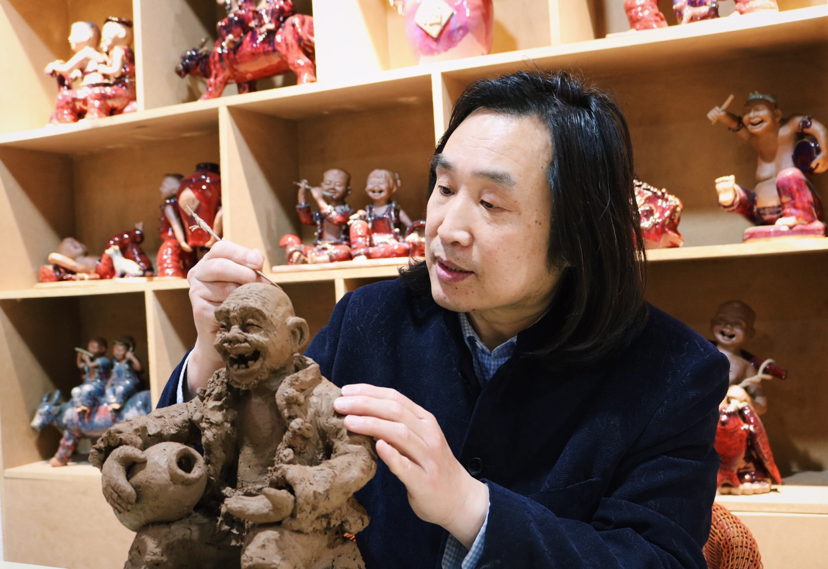 隨后,張振福又介紹了近期創(chuàng)作的慶祝中國(guó)共產(chǎn)黨成立100周年紅色主題泥塑《征途漫漫》《長(zhǎng)在黨旗下》《淮海戰(zhàn)役》《一個(gè)蘋(píng)果的故事》等。李尚武贊賞張振福泥塑風(fēng)格獨(dú)特、主題鮮明,傳遞了正能量,作品具有思想性、藝術(shù)性,充滿(mǎn)鄉(xiāng)情味、泥土味。