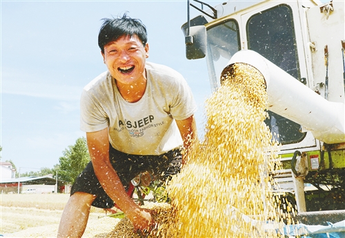 開封市尉氏縣邢莊鄉(xiāng)府李莊村,農(nóng)機(jī)服務(wù)隊幫助村民收獲小麥。 李新義攝(中經(jīng)視覺)