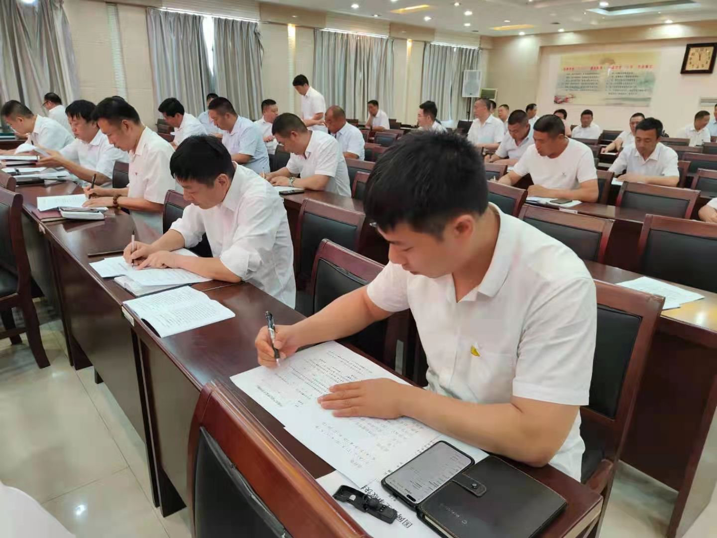 此次測試答題采取書面答卷的形式進(jìn)行,考題以單項(xiàng)選擇題、多項(xiàng)選擇題以及簡答論述題三種形式為主,旨在全面檢驗(yàn)公司黨員干部學(xué)習(xí)貫徹黨紀(jì)政紀(jì)條規(guī)的學(xué)習(xí)成果,促進(jìn)大家自覺“學(xué)紀(jì)、知紀(jì)、遵紀(jì)”。