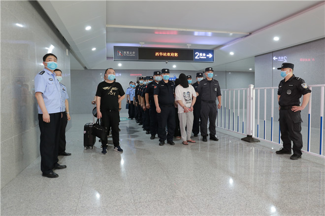 當天,西華縣公安局在鄭阜高鐵西華站舉行歡迎儀式,迎接赴西安抓捕組凱旋歸來。特警在站臺上排列整齊、嚴陣以待,列車準時??康秸?,7名犯罪嫌疑人隨即被押解下車,全副武裝的特警立即上前進行押解交接,押往在高鐵出站口等候的裝甲車上。至此,歷經(jīng)三天三夜,一起電信網(wǎng)絡詐騙團伙案成功告破。