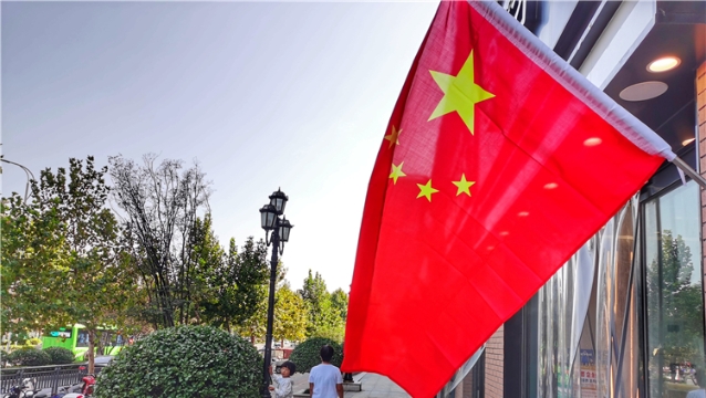 ?9月30日,市區(qū)臨街商鋪門前五星紅旗隨處可見,紅旗隨風(fēng)飄揚(yáng),將街道裝扮一新,喜迎國慶節(jié)的到來