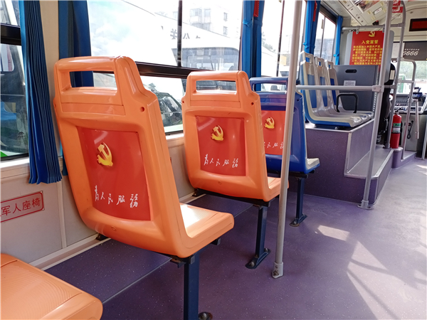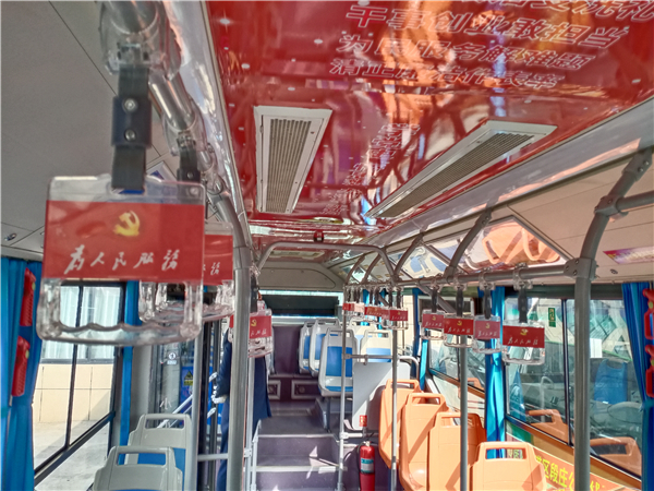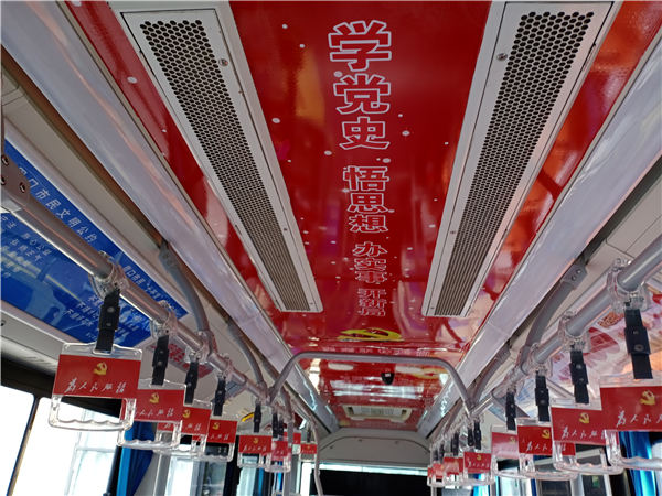圖片說(shuō)明:10月25日,記者在周口市公交總公司院內(nèi)看到,一輛車(chē)頭前印有“紅色主題班線”標(biāo)識(shí)的公交車(chē)格外引人注目,雖然該車(chē)的外形與其他車(chē)差別不大,可是車(chē)廂內(nèi)貼滿了紅色標(biāo)語(yǔ)口號(hào),給人耳目一新的感覺(jué)。記者看到,車(chē)廂內(nèi)的扶手、座椅及車(chē)頂上都貼有“為人民服務(wù)”“學(xué)黨史、悟思想、辦實(shí)事、開(kāi)新局”“革命小故事”等宣傳內(nèi)容。③2