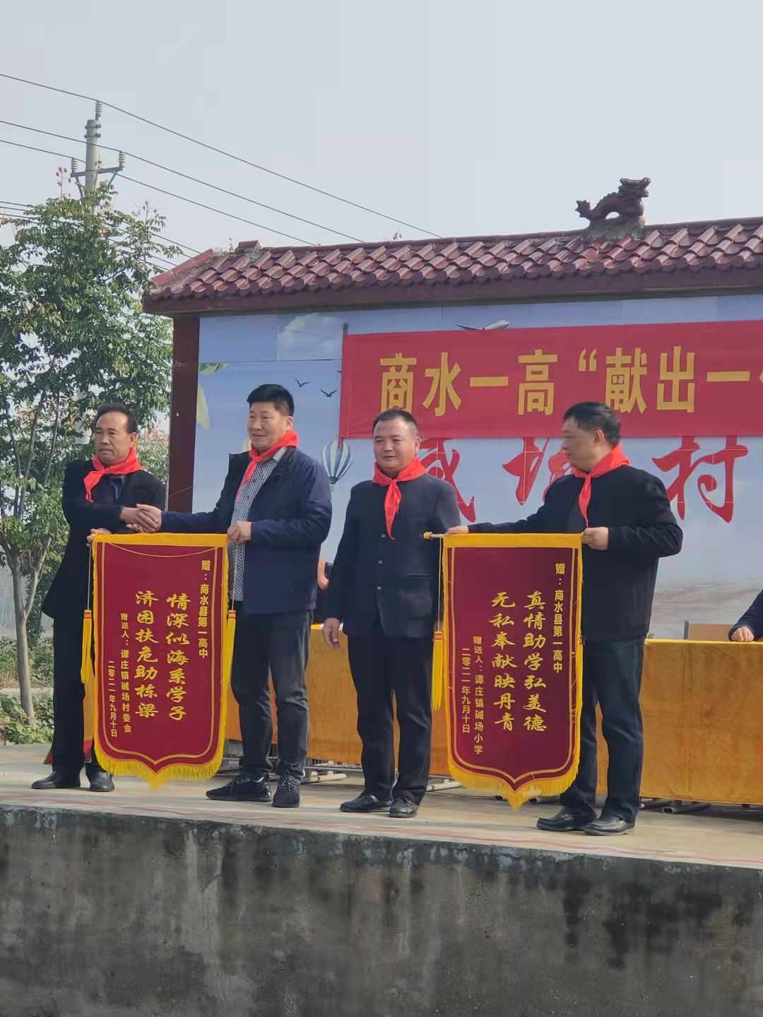 譚莊鎮(zhèn)堿場村村委會、譚莊鎮(zhèn)堿場小學(xué)分別向商水一高贈送內(nèi)容為“真情助學(xué)弘美德,無私奉獻(xiàn)映丹青”“情深似海系學(xué)子,濟(jì)困扶危助棟梁”的錦旗。
