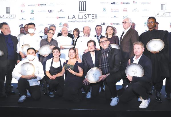 11月29日,在位于巴黎的法國外交部舉行的LA LISTE國際美食榜單揭曉活動現(xiàn)場,獲獎廚師合影留念。