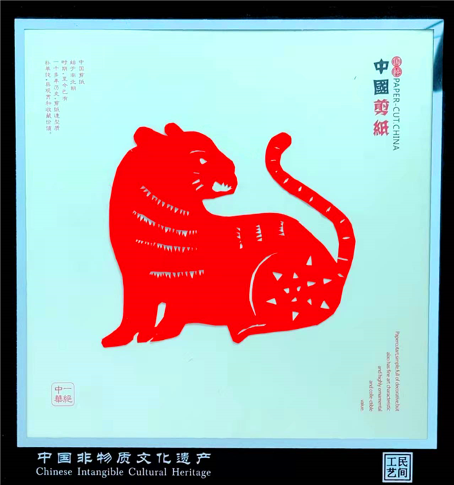 為了慶?;⒛辏醮好穭?chuàng)作的秸稈畫主要有《威震九霄》《虎之王者》《飛天神虎》等,此外,她還創(chuàng)作了兩幅剪紙作品,分別是《虎年組圖》和《虎之2022》。和剪紙作品相比,秸稈畫制作工序更加復雜,全憑手工完成,充分利用秸稈本身的紋理和質地,結合顏色、溫度的變化,將畫面立體的呈現(xiàn)出來。其中,她創(chuàng)作的部分作品結合了唐卡的相關風格和顏色配比,比如《威震九霄》中虎的形象所表現(xiàn)出來的力量感借鑒了唐卡中護法的力量感;《虎之王者》和《虎之2022》中對于藍色的運用結合了唐卡中的藍色,代表了永恒不變,如同穹蒼攬護萬物之意。