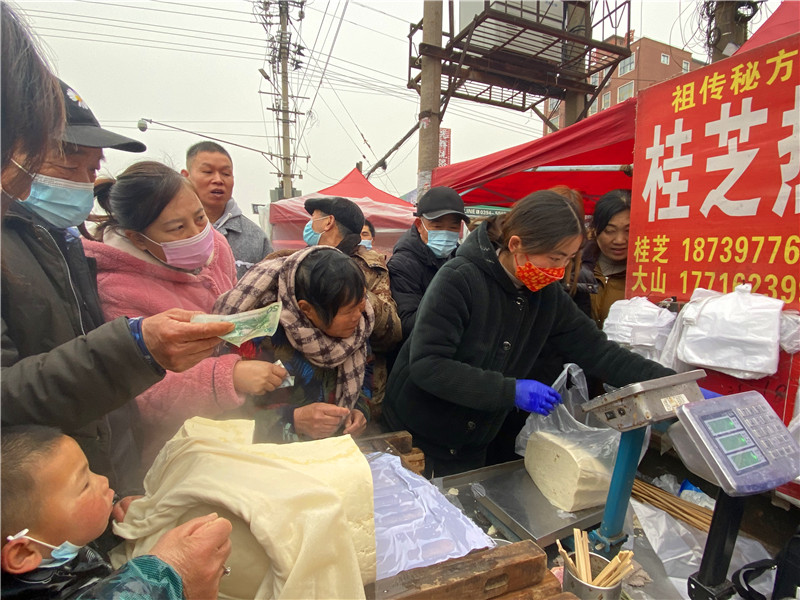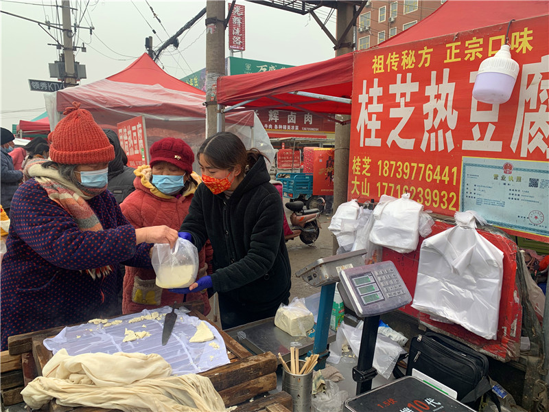 在固墻鎮(zhèn)的集市上,“桂枝熱豆腐”攤位前的顧客絡(luò)繹不絕。“給我來50塊錢的豆腐”“我要20斤,先給我切豆腐吧”“我要30斤,多少錢”……人群將豆腐攤里三層外三層圍了起來,從人群外朝里看看不見豆腐,只看到豆腐攤里冒出來的團(tuán)團(tuán)熱氣。“等了半個(gè)小時(shí)了,剛才那一盒豆腐沒輪到我就賣完了,這才搶到手。”附近的村民楊大爺拿著剛買的豆腐高興地說。“我從鹿邑來的,姐姐在里面擠著買豆腐,我在這兒等她呢。”9歲的張家瑞說,她每年放寒假都會(huì)和家人一起到固墻來探親,過年的時(shí)候逛逛集市,順便買些豆腐帶回鹿邑。
