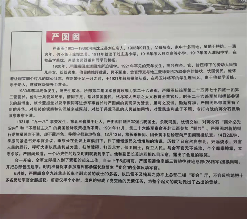 嚴(yán)圖閣出生于1903年,河南省沈丘縣人。1911年,嚴(yán)圖閣被父親送進(jìn)劉莊店小學(xué)讀書,1915年考入縣立高等小學(xué),1917年投考淮陽中學(xué)被錄取。他刻苦讀書,成績(jī)優(yōu)異,深得老師和同學(xué)們的贊揚(yáng)。1921年,他毅然背井離鄉(xiāng),外出從軍。1930年,嚴(yán)圖閣任國民革命軍第二十六路軍一團(tuán)三營營長。1931年12月,參加著名的寧都起義,成為中國共產(chǎn)黨領(lǐng)導(dǎo)的革命隊(duì)伍中的一員。寧都起義后,嚴(yán)圖閣所在部隊(duì)改編為紅軍第五軍團(tuán),由于其驍勇善戰(zhàn),累積戰(zhàn)功,被任命為第十六師參謀長。1932年,嚴(yán)圖閣正式加入中國共產(chǎn)黨。1935年在湖北一場(chǎng)戰(zhàn)斗中身負(fù)重傷,后轉(zhuǎn)移至湖南省平江縣治療。1936年3月,嚴(yán)圖閣奉命擔(dān)任湘鄂贛省軍區(qū)司令員職務(wù),進(jìn)行游擊戰(zhàn)爭(zhēng),為保衛(wèi)湘鄂贛革命根據(jù)地作出了貢獻(xiàn)。1936年11月,嚴(yán)圖閣因病不幸去世。