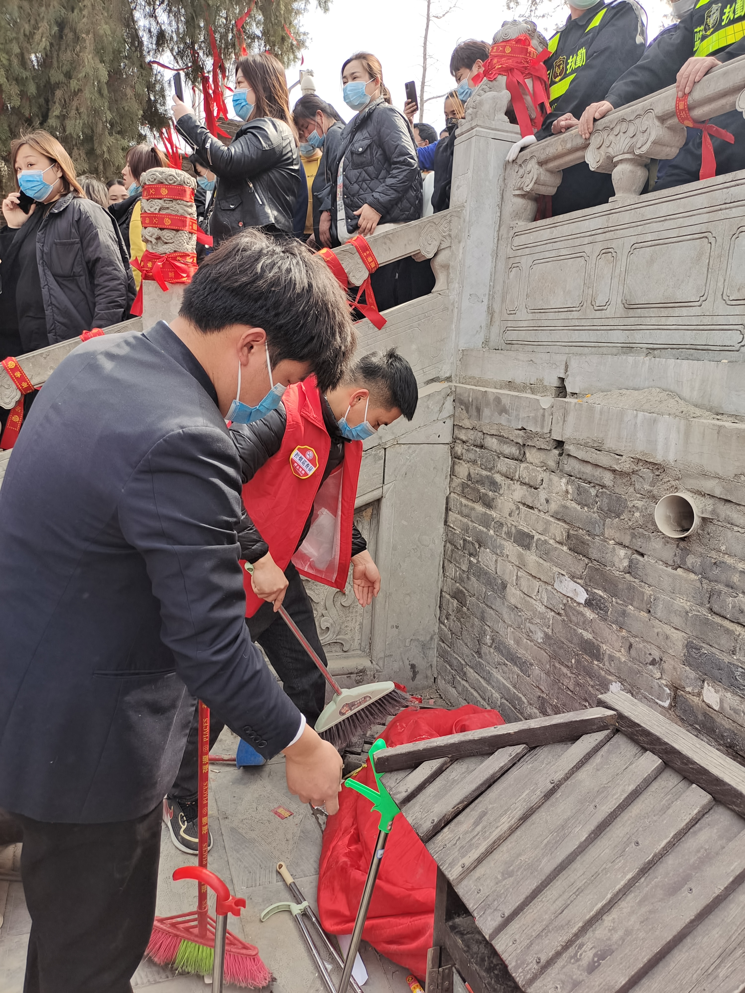 在伏羲陵墓后的蓍草園周圍,有人買紅布條系在欄桿上祈福,有人虔心祝禱。當(dāng)蓍草成為聚焦點(diǎn)時(shí),有人卻拿著打掃工具默默清理垃圾,讓蓍草園成為一方“凈土”。見他們身穿紅馬甲,記者上前詢問,原來是來自建業(yè)物業(yè)的志愿者,其中一名叫李小宇,他說太昊陵已經(jīng)成為淮陽門面,要做好衛(wèi)生,把太昊陵的良好形象維持住。“我們都是自愿前來,讓家鄉(xiāng)父老不論啥時(shí)候都看到一個(gè)干干凈凈的太昊陵!”李小宇說。