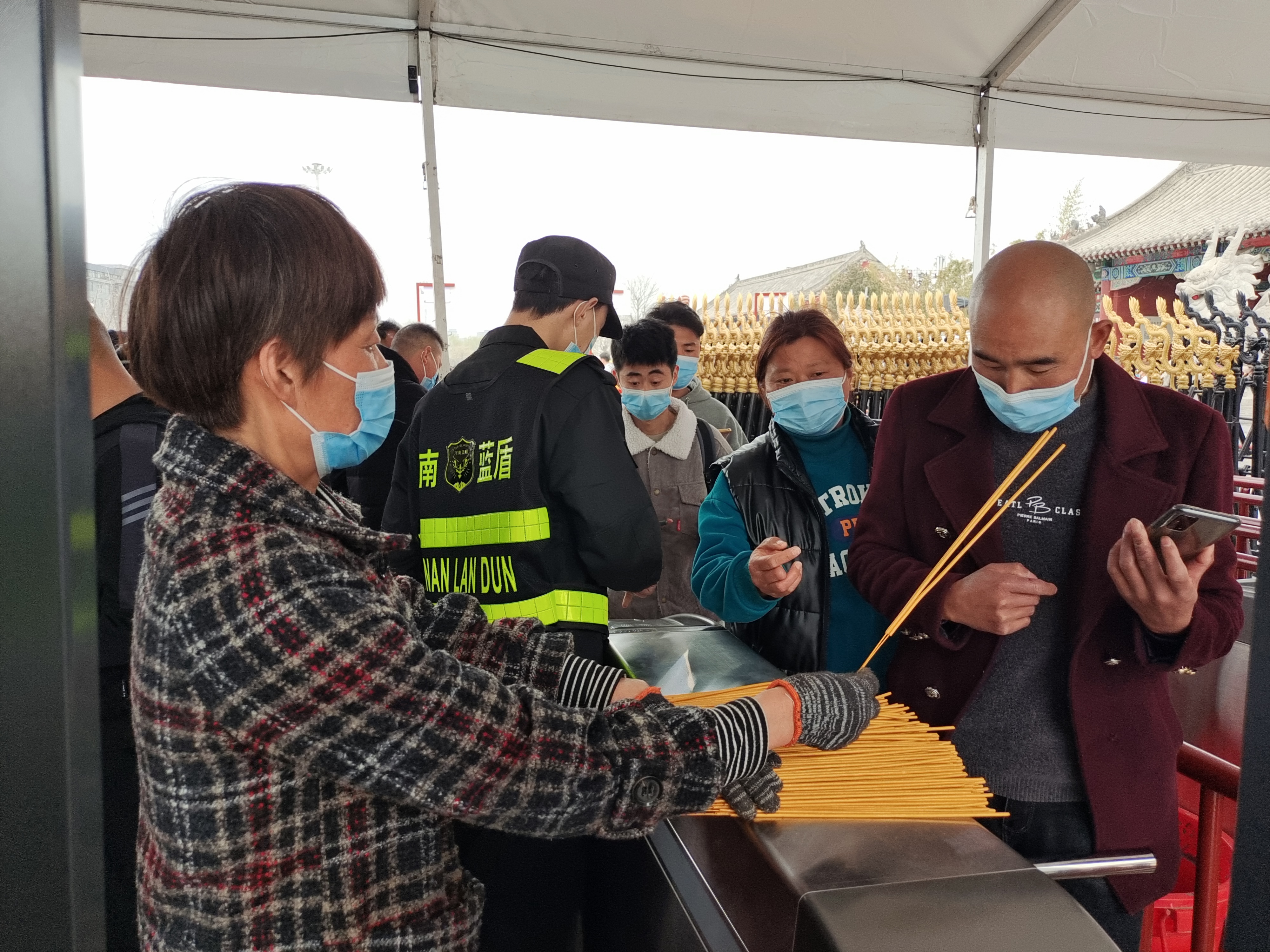 “這是您的祈福香,請(qǐng)拿好?!碧涣甑拿總€(gè)入口,既有專人檢查私自帶香行為,也有工作人員為游客免費(fèi)發(fā)放線香。家住淮陽區(qū)的李姐是其中一員,她早上5時(shí)30分就到達(dá)景區(qū),領(lǐng)取線香并整理,方便為游客發(fā)放?!爸灰€有游客來,我們就不休息,要把祈福的心愿送到他們手中,并引導(dǎo)他們文明燒香、文明祭祀。”李姐說。