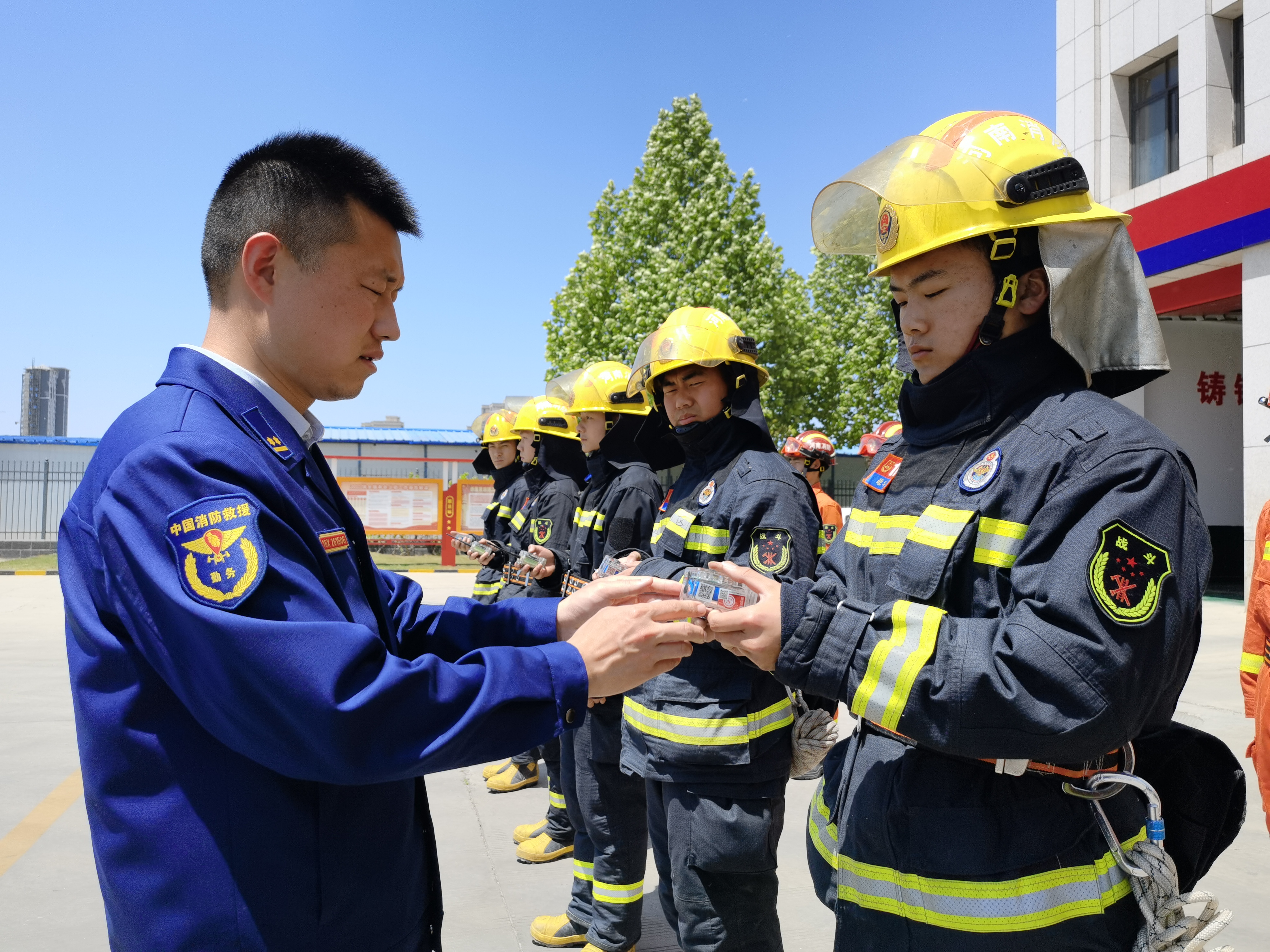 全封閉管理、備戰(zhàn)狀態(tài),檢查裝備、養(yǎng)護(hù)車(chē)輛,給消防救援人員上課……5月4日,示范區(qū)消防救援站指導(dǎo)員欒慶帥站在烈日下為消防救援隊(duì)員講授專業(yè)救援技巧和專業(yè)工具使用方法。