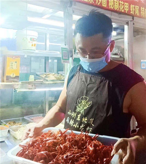 此時,在“東北小剛”麻辣小龍蝦夜攤前,已經(jīng)擺放好了幾張桌子,三五成群的客人相繼前來落座??腿它c(diǎn)餐后,只見攤主“小剛”就站在操作臺前,手腳麻利地將提前準(zhǔn)備好的小龍蝦等菜品一一裝盤,然后送到客人面前,忙得不可開交。