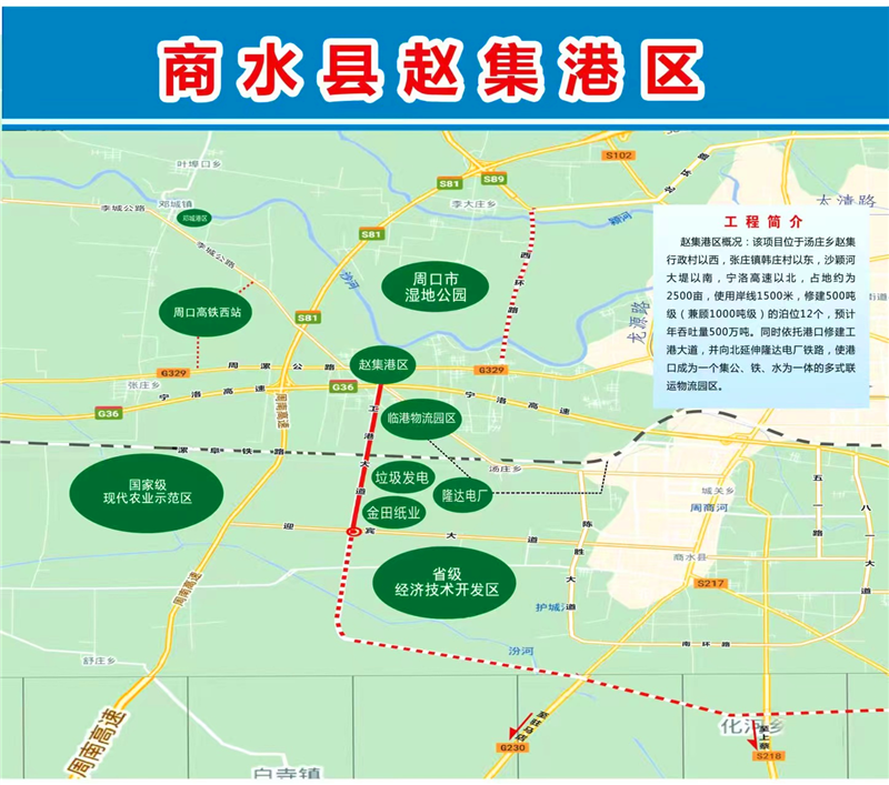 2017年,商水縣政府按照前瞻30年、謀劃15年、做實近5年工作要求,開始規(guī)劃修建位于湯莊鄉(xiāng)趙集行政村以西,張莊鎮(zhèn)韓莊村以東,沙潁河大堤以南,寧洛高速以北的趙集作業(yè)區(qū)。規(guī)劃建設(shè)占地約720畝、總投資6.37億元的趙集港項目,同時修建12個1000噸級泊位,其中散貨泊位8個,通用泊位2個,多用途泊位2個,占用岸線1250米,預(yù)計年吞吐量達475萬噸。碼頭采用順岸式布置,結(jié)構(gòu)采用重力式扶壁結(jié)構(gòu),前沿配置30噸門座式固定吊裝卸作業(yè)。港口涵蓋貨物拆解區(qū)、散件堆放區(qū)等4個功能區(qū),集裝箱露天堆場、大型貨車停車場等5個場地。圍繞趙集港,高標準規(guī)劃建設(shè)占地約6.2平方公里的多式聯(lián)運臨港經(jīng)濟園區(qū),下設(shè)金田紙業(yè)、建材倉儲兩個物流園區(qū),涵蓋建材及建材制品園區(qū)、造紙業(yè)原料及成品園區(qū)、紡織服裝原料及成品園區(qū)3個功能園區(qū)。該項目建成投入使用后,不但能加快商水縣紡織園區(qū)、循環(huán)園區(qū)、經(jīng)濟開發(fā)區(qū)、隆達電廠等企業(yè)物質(zhì)的流轉(zhuǎn),而且能使商水港成為周口沙潁河重要的鐵運、陸運、水運交通樞紐、貨物貿(mào)易和物流中轉(zhuǎn)聚集區(qū),從而進一步促進商水經(jīng)濟的健康、快速發(fā)展。