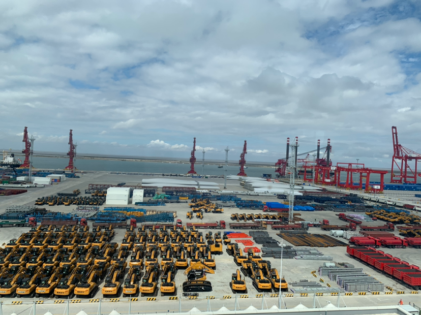 由于疫情防控的原因,記者沒能進入港口核心區(qū),只能站在港口辦公大樓樓頂遠眺港口。站在樓頂,港口景觀盡收眼底——挖掘機和風(fēng)機葉片被“碼”的整整齊齊,正待裝船出口;機器不停運轉(zhuǎn),給停靠的船只裝卸貨物;重型貨柜車進出有序、川流不息。而令人驚奇的是,諾大的港口空無一人。