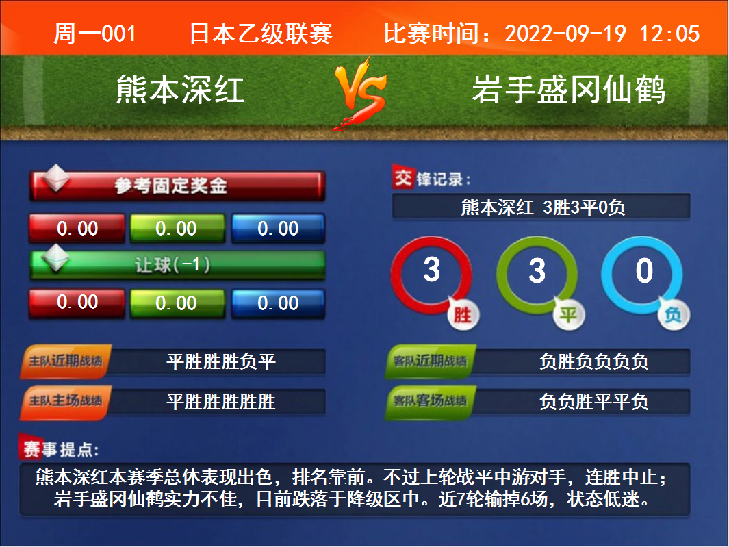 周一001 日本乙級(jí)聯(lián)賽 熊本深紅VS巖手盛岡仙鶴