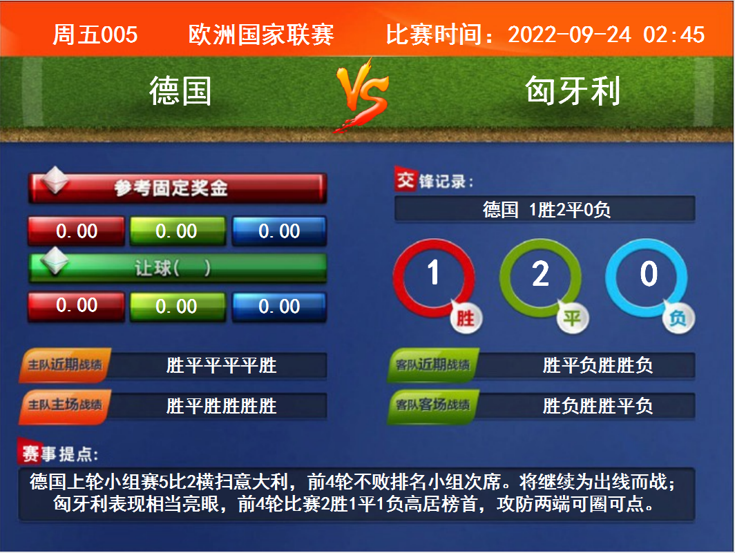 比賽時(shí)間:2022-09-24 02:45賽事提點(diǎn):德國上輪小組賽5比2橫掃意大利,前4輪不敗排名小組次席。將繼續(xù)為出線而戰(zhàn);匈牙利表現(xiàn)相當(dāng)亮眼,前4輪比賽2勝1平1負(fù)高居榜首,攻防兩端可圈可點(diǎn)。