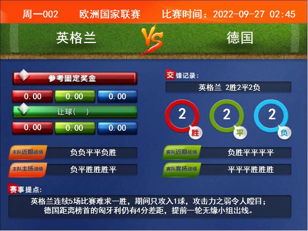 比賽時(shí)間:2022-09-27 02:45賽事提點(diǎn):英格蘭連續(xù)5場(chǎng)比賽難求一勝,期間只攻入1球,攻擊力之弱令人瞠目;德國(guó)距離榜首的匈牙利仍有4分差距,提前一輪無(wú)緣小組出線(xiàn)。