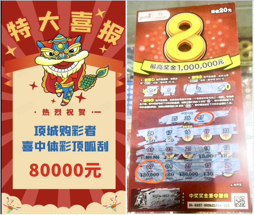 日前,張先生路過項(xiàng)城4116810161體彩實(shí)體店時挑選了幾張面值10元的“超值8”。沒想到其中一張竟刮出了8萬元大獎。