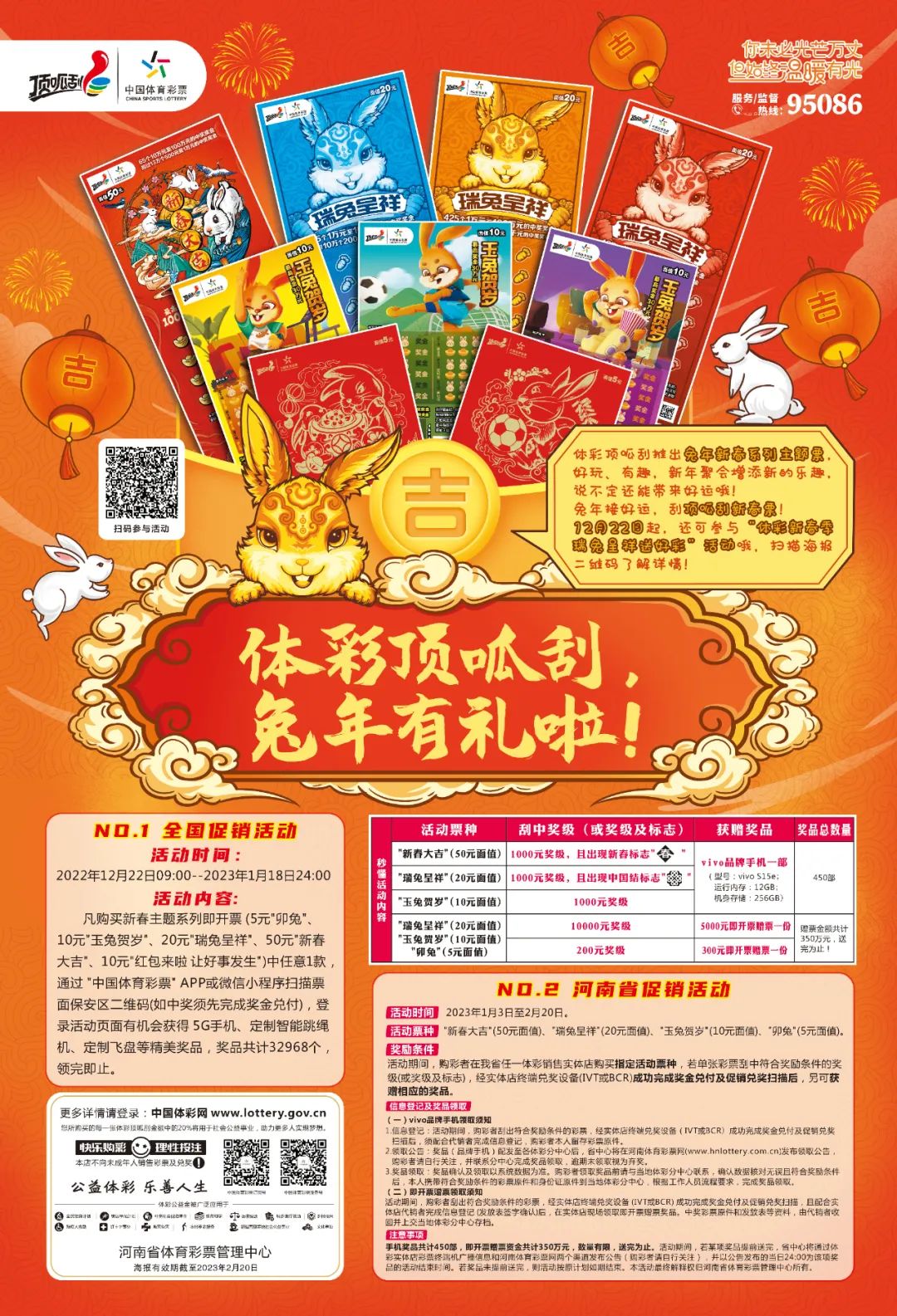 2.“體彩新春季”全國促銷活動細(xì)則詳見“中國體育彩票”微信小程序或“中國體育彩票”APP活動頁面,或登錄中國體彩網(wǎng)查詢相關(guān)信息。