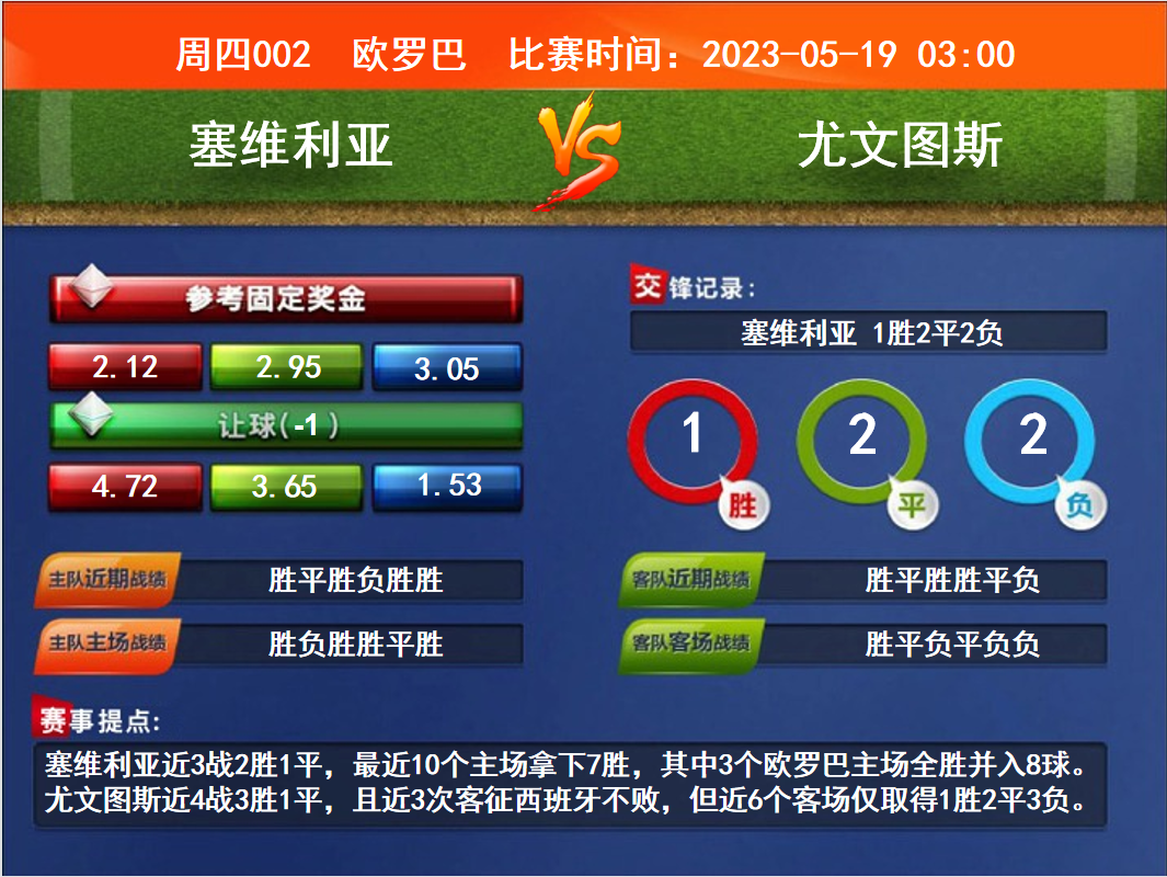 比賽時間:2023-05-19 03:00賽事提點:塞維利亞近3戰(zhàn)2勝1平,最近10個主場拿下7勝,其中3個歐羅巴主場全勝并入8球。尤文圖斯近4戰(zhàn)3勝1平,且近3次客征西班牙不敗,但近6個客場僅取得1勝2平3負(fù)。