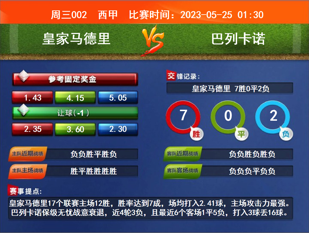 比賽時(shí)間:2023-05-25 01:30 賽事提點(diǎn):皇家馬德里17個(gè)聯(lián)賽主場12勝,勝率達(dá)到7成,場均打入2.41球,主場攻擊力最強(qiáng)。巴列卡諾保級(jí)無憂戰(zhàn)意衰退,近4輪3負(fù),且最近6個(gè)客場1平5負(fù),打入3球丟16球。