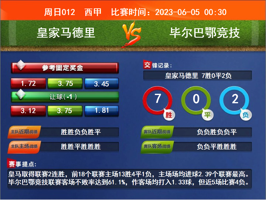 比賽時間:2023-06-05 00:30賽事提點(diǎn):皇馬取得聯(lián)賽2連勝,前18個聯(lián)賽主場13勝4平1負(fù),主場場均進(jìn)球2.39個聯(lián)賽最高。畢爾巴鄂競技聯(lián)賽客場不敗率達(dá)到61.1%,作客場均打入1.33球,但近5場比賽4負(fù)。