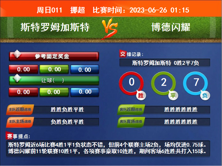 比賽時(shí)間:2023-06-26 01:15賽事提點(diǎn):斯特羅姆近6場比賽4勝1平1負(fù)狀態(tài)不錯(cuò),但前4個(gè)聯(lián)賽主場2負(fù),場均僅進(jìn)0.75球。博德閃耀前11輪聯(lián)賽10勝1平,各項(xiàng)賽事豪取10連勝,期間客場6連勝共打入15球。