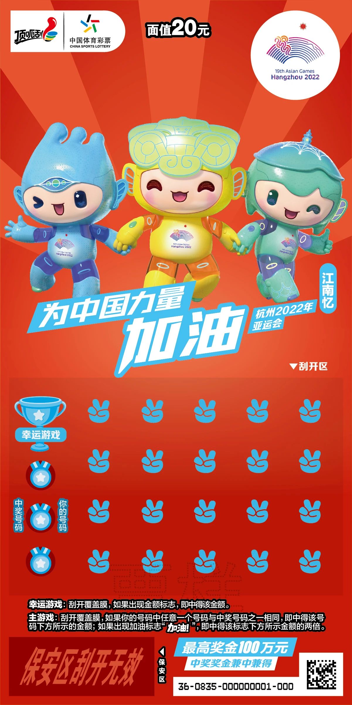 在杭州亞運(yùn)會(huì)開幕倒計(jì)時(shí)200天之際,浙江體彩推出“為中國力量加油”杭州亞運(yùn)會(huì)主題即開型體育彩票,票面以亞運(yùn)會(huì)吉祥物“琮琮”“蓮蓮”“宸宸”為主體形象,將具有親和力的吉祥物與充滿活力的網(wǎng)球、游泳、籃球、乒乓球等體育運(yùn)動(dòng)相結(jié)合,以動(dòng)感時(shí)尚形式展示亞運(yùn)會(huì)賽事項(xiàng)目。