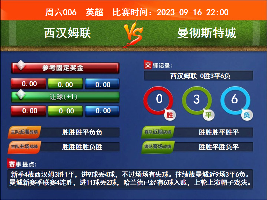 比賽時間:2023-09-16 22:00賽事提點:新季4戰(zhàn)西漢姆3勝1平,進9球丟4球,不過場場有失球。往績戰(zhàn)曼城近9場3平6負(fù)。曼城新賽季聯(lián)賽4連勝,進11球丟2球,哈蘭德已經(jīng)有6球入賬,上輪上演帽子戲法。