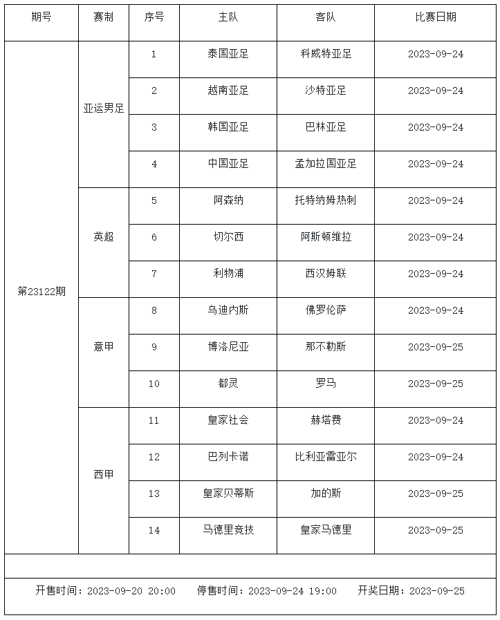 足球彩票勝負(fù)游戲(14場(chǎng)和任選9場(chǎng))第23122期賽程:
