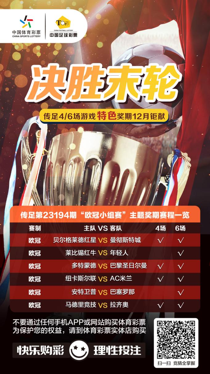 第23194期傳足特色獎(jiǎng)期已經(jīng)于12月10日20:00開(kāi)售,將于12月13日22:00停售,并于12月14日開(kāi)獎(jiǎng)。其中貝爾格萊德紅星VS曼徹斯特城、多特蒙德VS巴黎圣日爾曼、紐卡斯?fàn)柭?lián)VSAC米蘭和馬德里競(jìng)技VS拉齊奧為4場(chǎng)進(jìn)球游戲競(jìng)猜賽事。