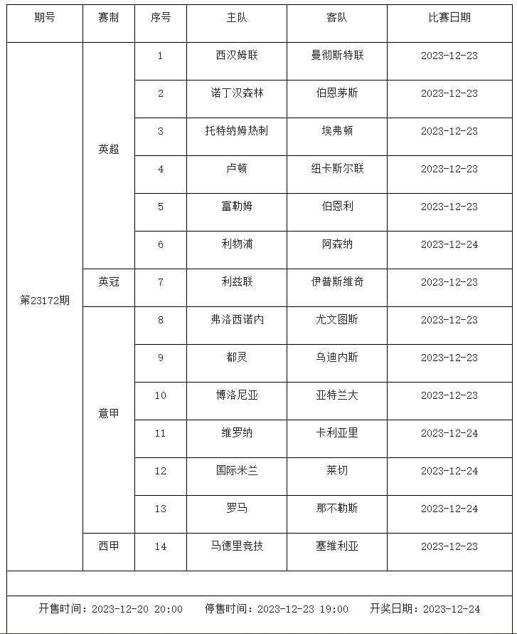 足球彩票勝負游戲(14場和任選9場)第23172期賽程: