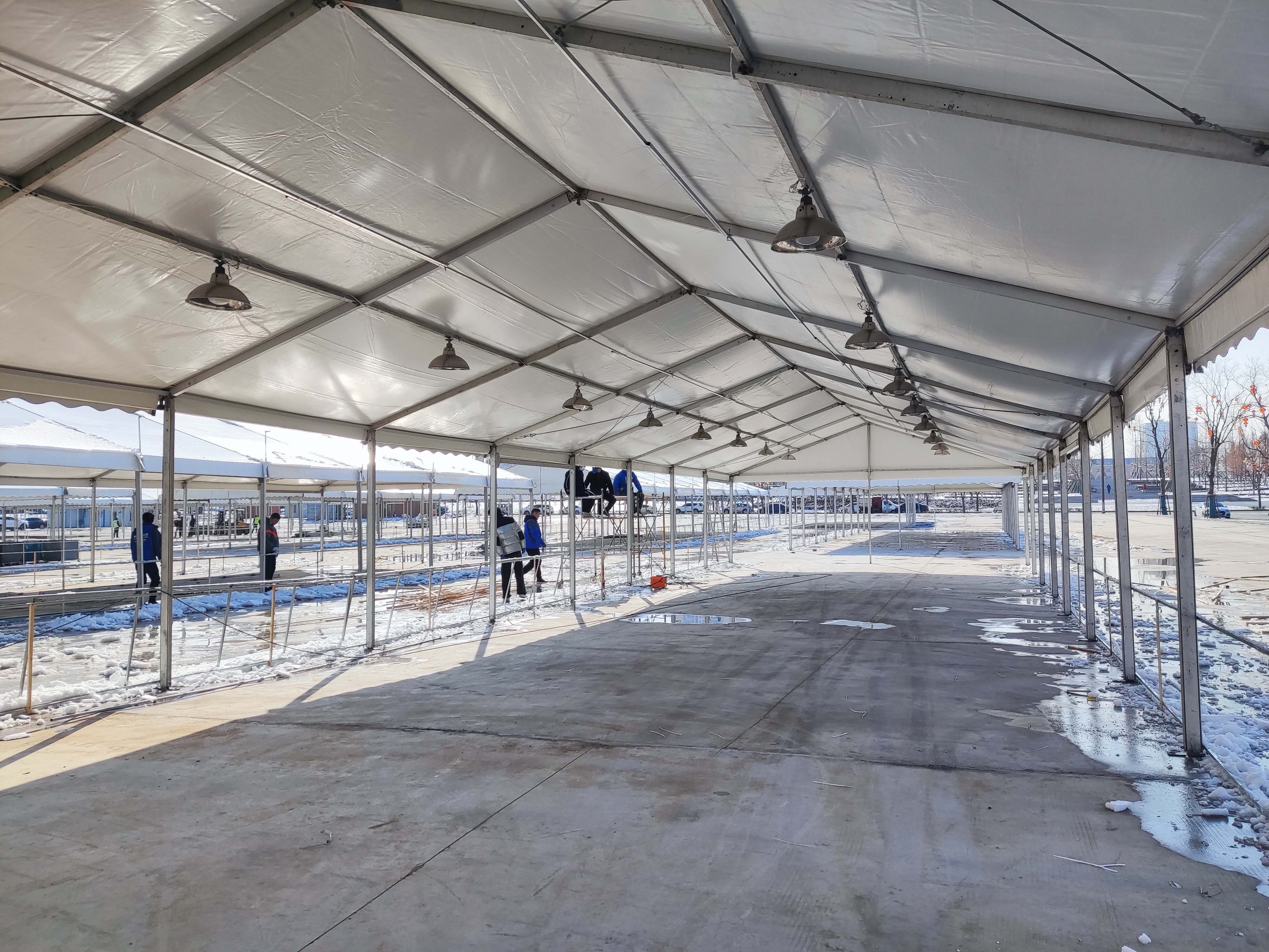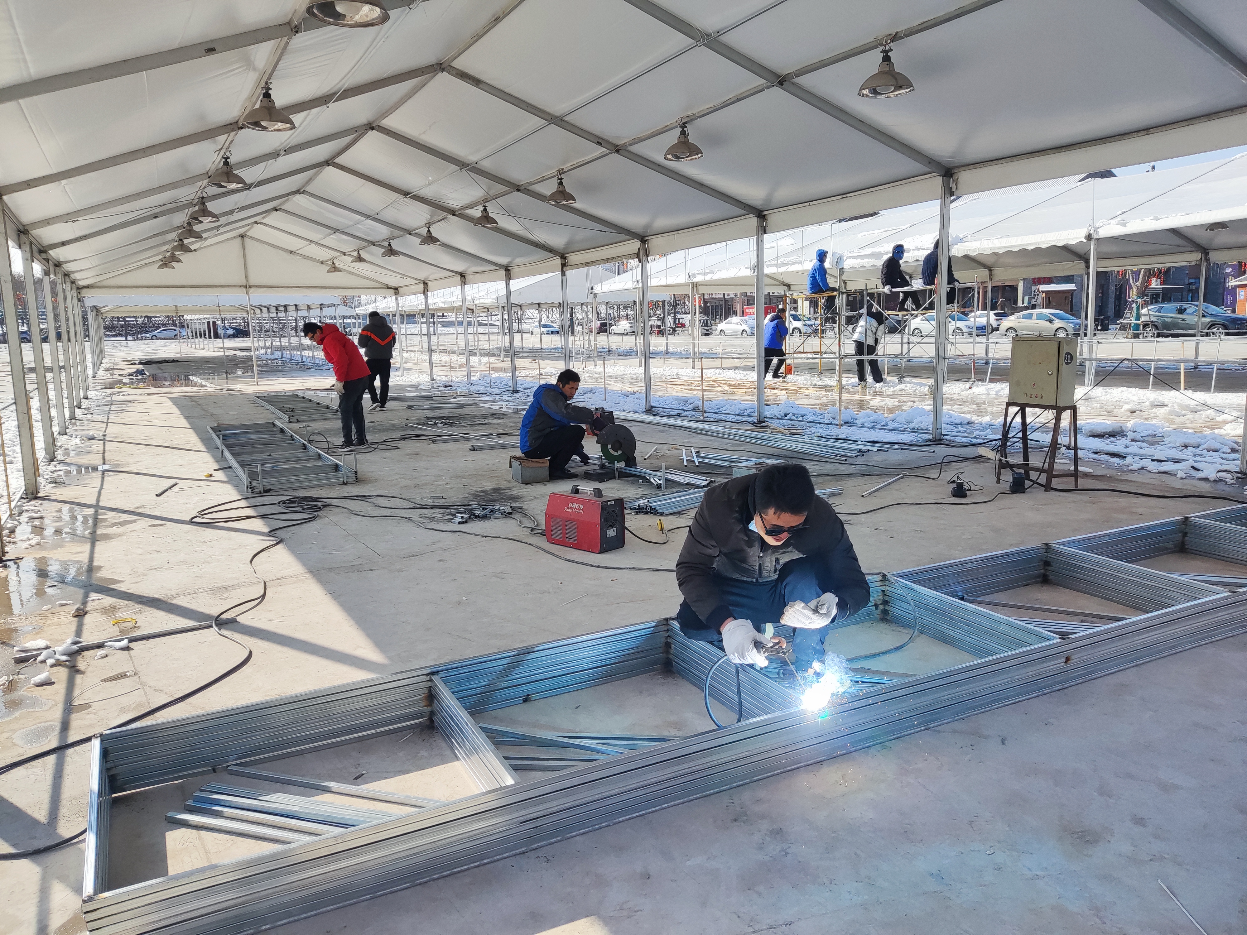1月23日記者在現(xiàn)場看到,展區(qū)大篷內(nèi),工人正在做水電安裝、焊接等掃尾工作。