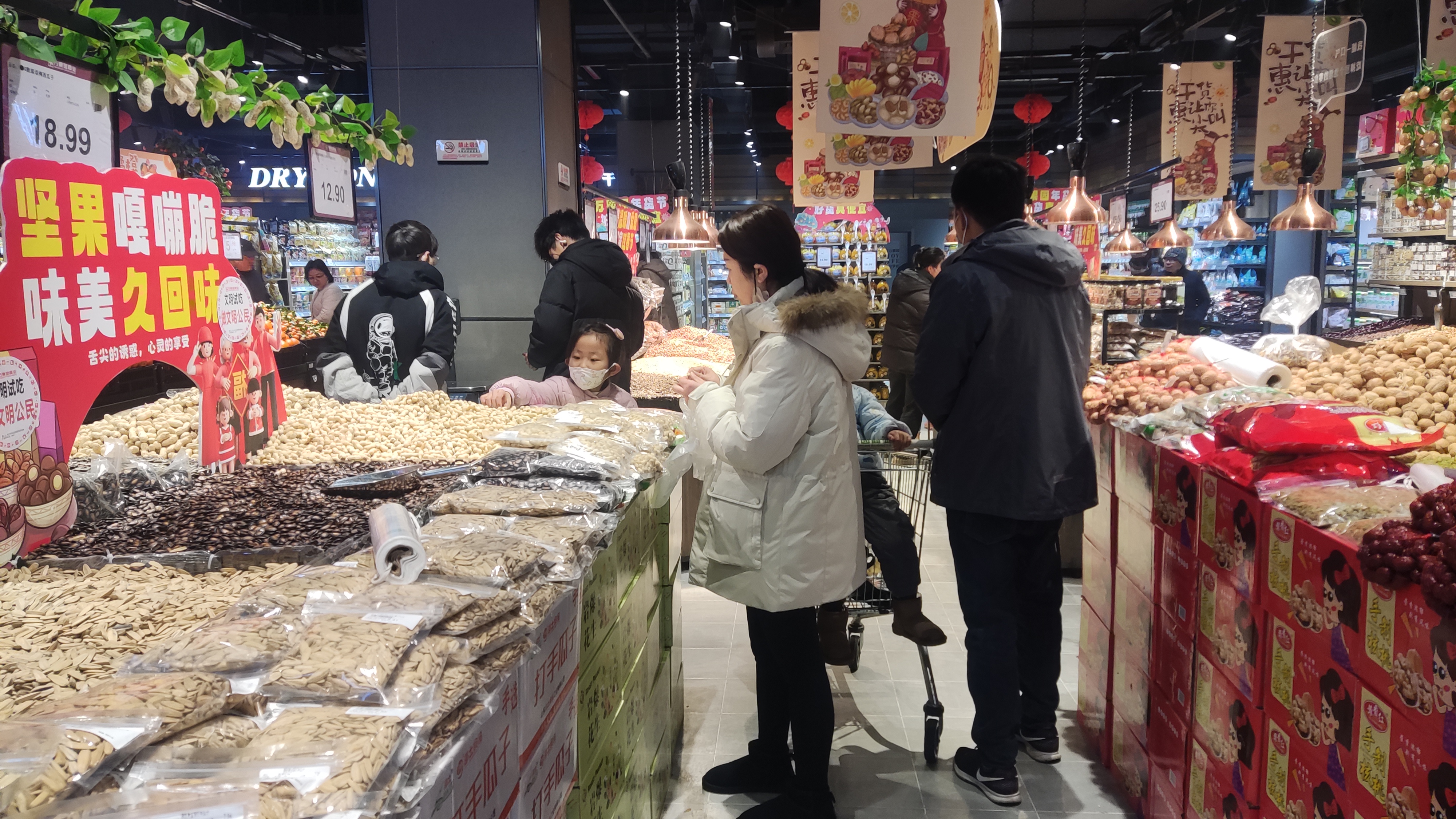 核桃、巴旦木、夏威夷果、碧根果……市民陳女士拎著一大包商品滿載而歸?!俺詧怨】涤逐B(yǎng)生,家里人都喜歡吃,過年期間一家人邊聊天邊吃堅果,滿滿年味?!标惻空f,組合裝小袋堅果比較劃算,里面有剝好的杏仁、核桃、腰果等,價格不貴,方便實惠。