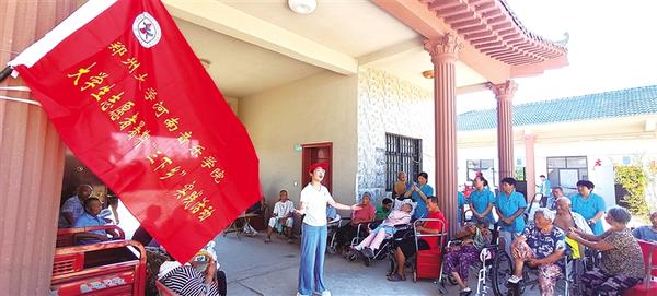 8月16日,鄭州大學(xué)大學(xué)生(左一)為太康縣高賢鄉(xiāng)汪莊村醫(yī)養(yǎng)院的老人們演唱歌曲。當(dāng)日,由鄭州大學(xué)河南音樂(lè)學(xué)院、哲學(xué)學(xué)院大學(xué)生王子奇、王子祎、邵彤組成的“三下鄉(xiāng)”服務(wù)小分隊(duì)走進(jìn)該醫(yī)養(yǎng)院,開(kāi)展“情暖夕陽(yáng)·愛(ài)駐心間”社會(huì)實(shí)踐活動(dòng),為生活在這里的老人們打掃衛(wèi)生、表演節(jié)目,醫(yī)養(yǎng)院里充滿了其樂(lè)融融的氛圍。
