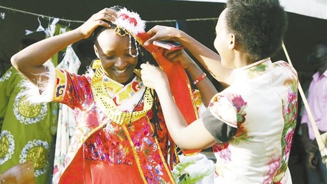 11月10日,學生在盧旺達卡永扎試穿中國服飾?!?a href="http://m.dwzyxx.com/content/2021-11/13/content_959142.html" target="_blank" >[詳細]