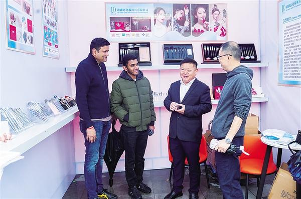 11月16日,鹿邑縣化妝刷企業(yè)的工作人員向兩名外國(guó)客戶(左一、左二)介紹產(chǎn)品。當(dāng)天,鹿邑縣首屆美妝、化妝刷展銷會(huì)在弘道苑廣場(chǎng)開幕。本屆展銷會(huì)為期3天,吸引100多家企業(yè)參展。 ...[詳細(xì)]