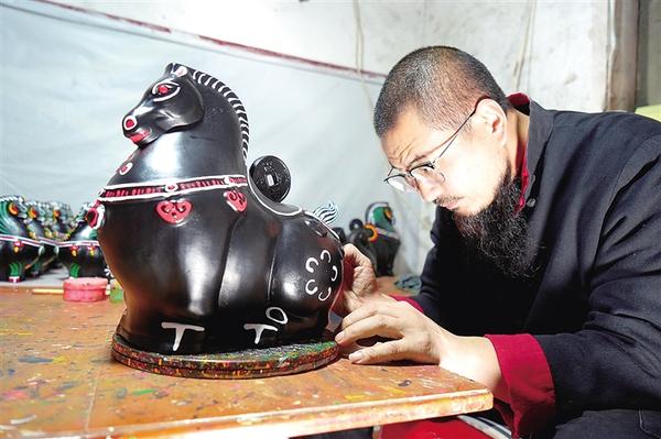 該日上午,邵波與妻子劉保青及工匠們正加緊趕制馬年系列作品《馬上有財》。與傳統(tǒng)泥泥狗古樸神秘的風(fēng)格不同,這組馬年作品呈現(xiàn)出明顯的“萌寵化”特征。
