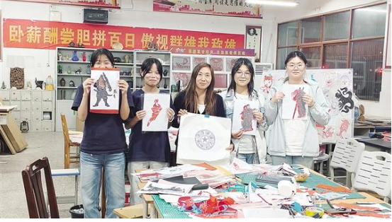 9月26日,淮陽中學的藝術(shù)教室里,王海英正指導學生剪紙。