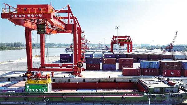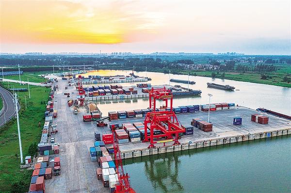 作為國家重點建設(shè)的36個內(nèi)河港口之一,目前,周口中心港已建成投用47個千噸級泊位,年吞吐能力達3000萬噸,開通18條國內(nèi)集裝箱航線及14條國際集裝箱航運通道,實現(xiàn)了“箱通世界、貨運全球”。圖為記者近日拍攝的周口中心港碼頭集裝箱裝船作業(yè)現(xiàn)場。