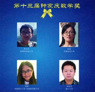 中國(guó)數(shù)學(xué)會(huì)21日揭曉了第十三屆華羅庚數(shù)學(xué)獎(jiǎng)、第十六屆陳省身數(shù)學(xué)獎(jiǎng)和第十三屆鐘家慶數(shù)學(xué)獎(jiǎng)的獲獎(jiǎng)名單。今年獲得鐘家慶數(shù)學(xué)獎(jiǎng)的分別是美國(guó)斯坦福大學(xué)的樊玉偉(來(lái)自河南周口)、首都師范大學(xué)的張蕊、西南財(cái)經(jīng)大學(xué)和美國(guó)密西根大學(xué)的周嶺、浙江大學(xué)的周青龍等4名博士生?!?a href="http://m.dwzyxx.com/content/2017-10/23/content_581562.htm" target="_blank" >[詳細(xì)]