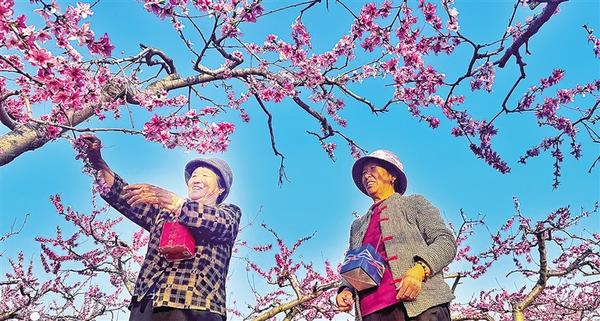 4月1日,扶溝縣固城鄉(xiāng)秦嶺行政村的一個(gè)桃園內(nèi),果農(nóng)正對桃花進(jìn)行人工輔助授粉,以提高坐果率,全力保豐收。
