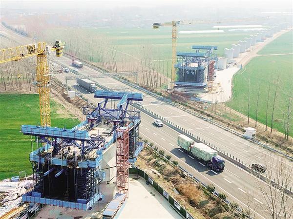 3月6日上午,工人們正在平漯周高鐵跨商南高速公路大橋處緊張施工。據(jù)了解,該橋是平漯周高鐵最東端的一座跨高速公路大橋。
