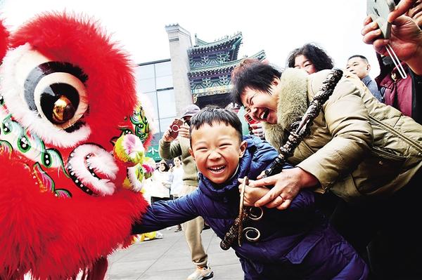 1月22日,孩子和“獅子”親密接觸,既開心又緊張。當(dāng)日,隨著第二屆“三川十館·春會”開幕,處處洋溢著歡快的新年氛圍。