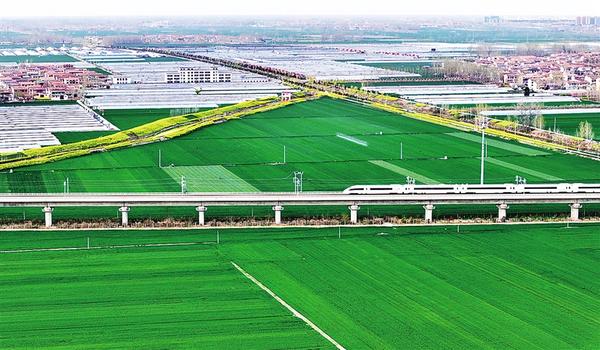 4月11日,一列高鐵列車駛過扶溝縣境內(nèi)廣袤的麥田。近年來,扶溝縣累計(jì)建成高標(biāo)準(zhǔn)農(nóng)田119.7萬畝,疏浚治理河道64公里,維修重建閘涵33座,為實(shí)現(xiàn)穩(wěn)產(chǎn)增收提供了堅(jiān)實(shí)保障。
