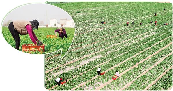 近年來,我市積極推廣“合作社+農(nóng)戶”“家庭農(nóng)場+農(nóng)戶”經(jīng)營模式,鼓勵(lì)農(nóng)民通過土地流轉(zhuǎn)將分散耕地整合起來,實(shí)現(xiàn)集中化、規(guī)?;?jīng)營,全力提高土地利用效率,為鄉(xiāng)村振興注入強(qiáng)勁動(dòng)力。圖為4月11日,在淮陽區(qū)王店街道范莊行政村的農(nóng)田里,村民正采收蔬菜。