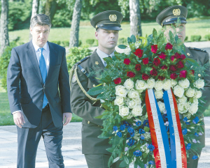 ?、?月9日,在克羅地亞首都薩格勒布,克總理米拉諾維奇(左)在紀念反法西斯戰(zhàn)爭勝利70周年的活動中向人民英雄紀念碑敬獻花圈。新華社發(fā)