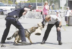 加拿大迎來全國警察周      5月9日, 在加拿大溫哥華地區(qū)的素里市,警察在警局開放日活動(dòng)上向民眾示范警犬訓(xùn)練情況。為迎接一年一度的全國警察周,素里市皇家騎警總部當(dāng)日舉辦開放日活動(dòng),向民眾展示警方裝備及介紹警隊(duì)日常工作。新華社發(fā)