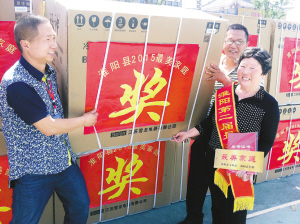 左圖  5月19日,淮陽縣隆重表彰63戶2015年度“最美家庭”。近年來,該縣依托“婦女之家”,通過召開座談會(huì)、講親情故事、曬照片等形式,大力開展尋找“最美家庭”活動(dòng),取得了良好的社會(huì)效果。圖為當(dāng)選“最美家庭”的齊國蘭高興地領(lǐng)取獎(jiǎng)品。