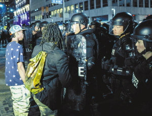 5月23日,在美國俄亥俄州克利夫蘭,兩名抗議者與警察對峙。美國俄亥俄州克利夫蘭市一名在2012年參與槍擊致死兩名未持武器的黑人而遭到刑事起訴的白人警察,23日被判無罪。此后,當(dāng)?shù)爻霈F(xiàn)抗議。
